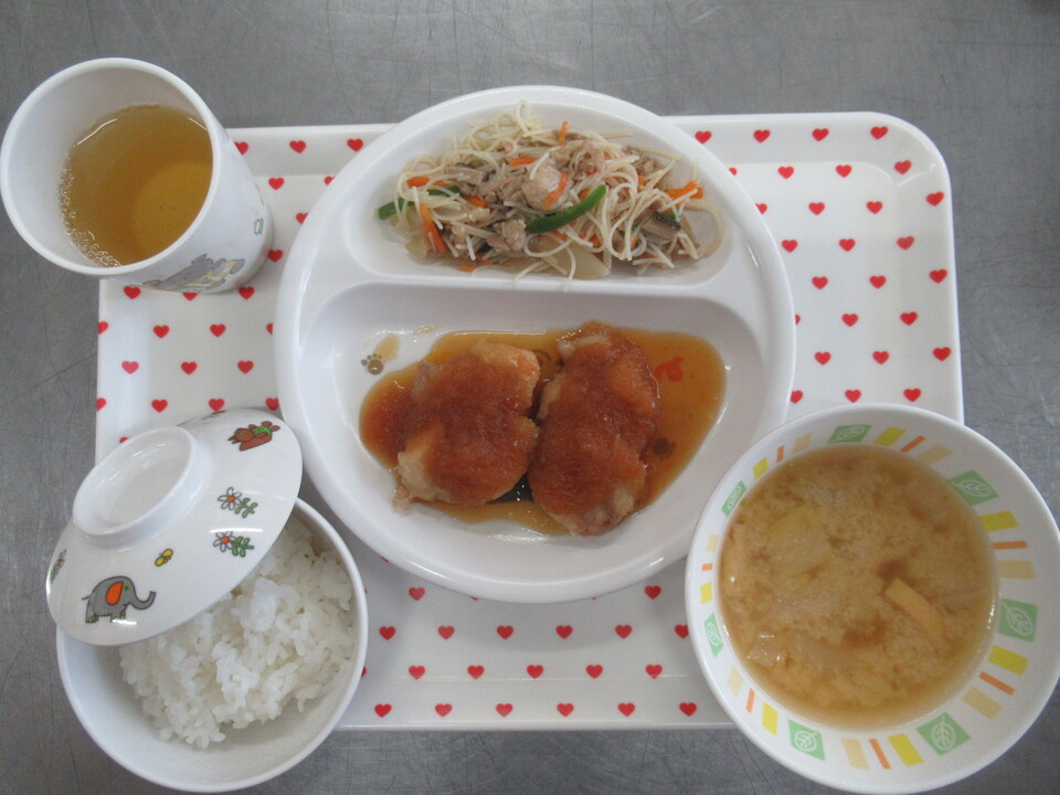 ご飯 鶏肉のオニオンソースかけ 炒めビーフン 白菜と打ち豆の味噌汁