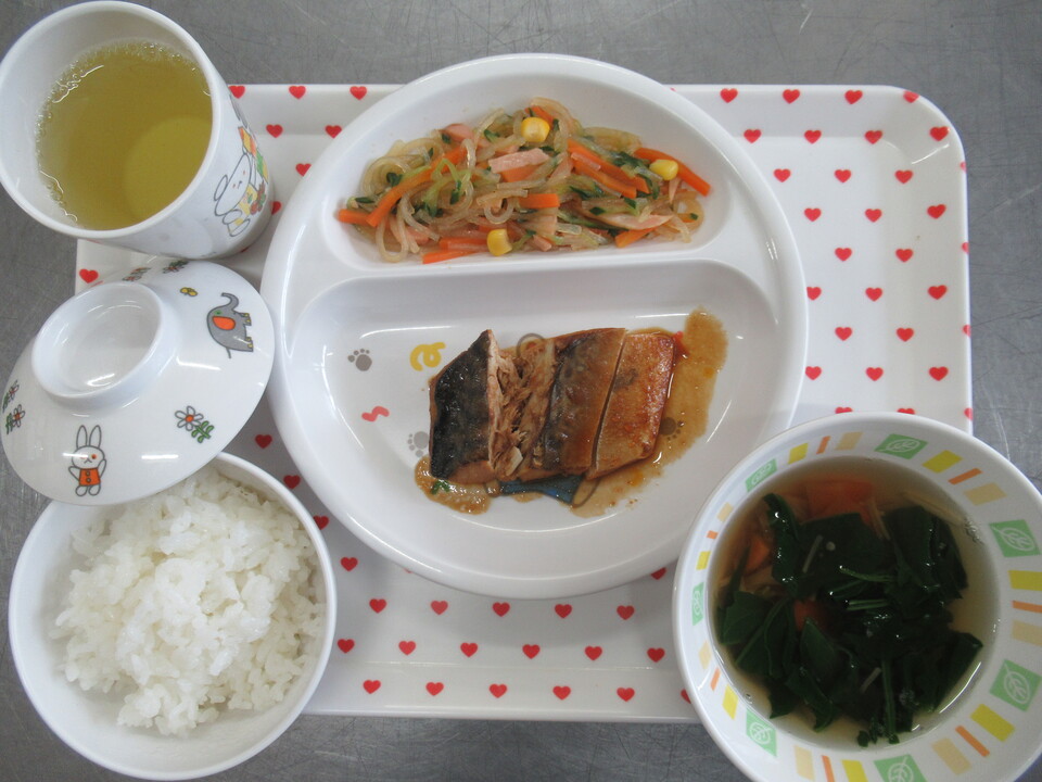 ご飯 鯖の味噌煮 春雨の酢の物 えのきとほうれん草のすまし汁