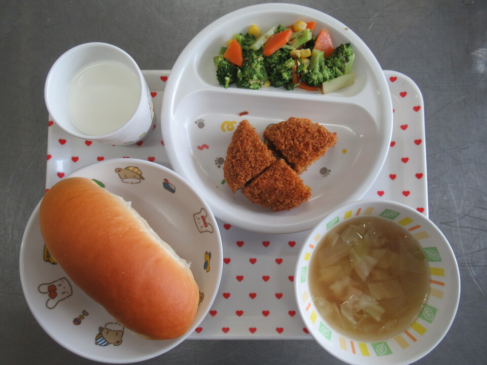 コッペパン メンチカツ ブロッコリーのごまドレ和え キャベツと玉ねぎのスープ 牛乳