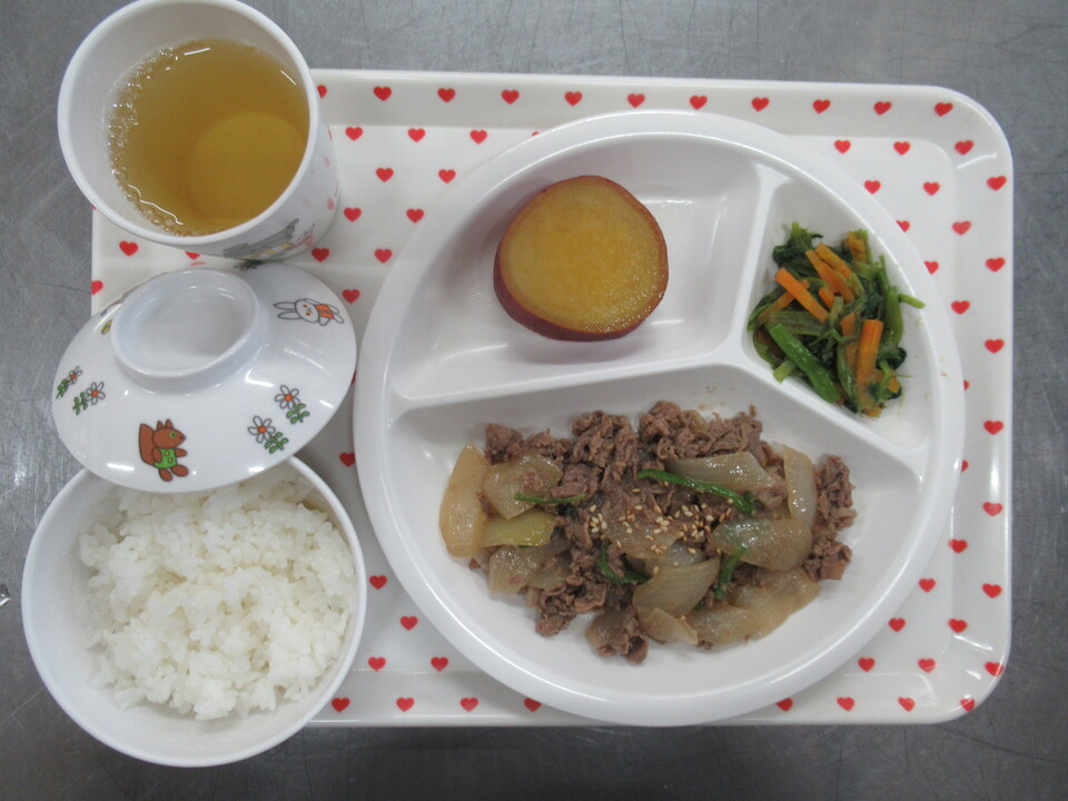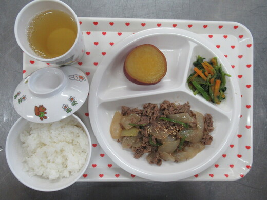 ご飯 焼肉風炒め さつま芋の甘煮 小松菜のお浸し